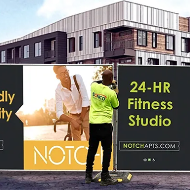 SOLUTION: SONCO printed ads created by our design team on high-quality materials and delivered them to each Milhaus property for free. This turned their job sites into effective advertisements, boosting brand awareness and generating interest in existing properties. Plus, the screens last for years.